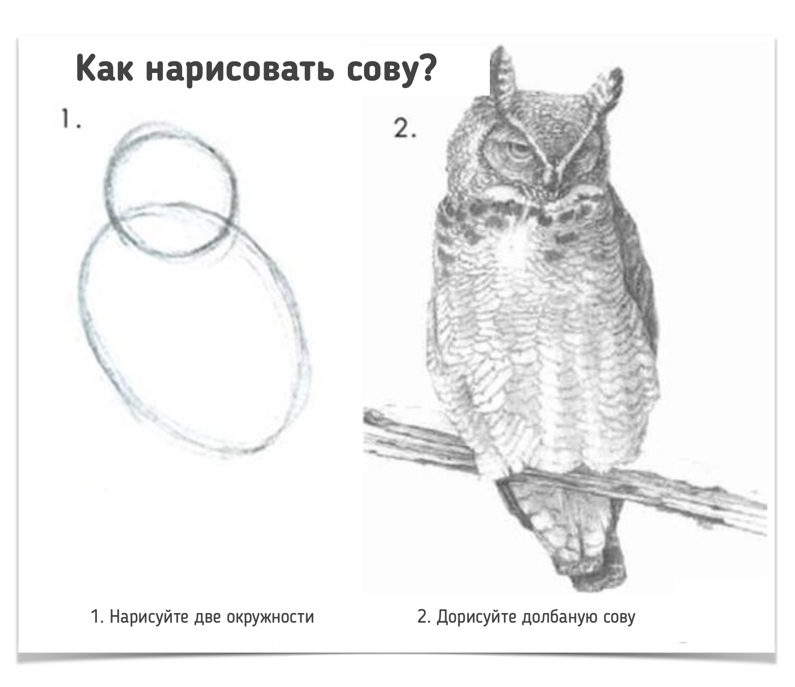Огоромное число статей-инструкций написаны в логике совы. Это самая распространенная среди авторов и самая неприятная для читателей ошибка. Распространенная, потому что давать такие советы легко и выглядят они убедительно. Неприятная, потому что читатель чувствует себя обманутым: совет вроде бы верный, но заведомо невыполнимый.